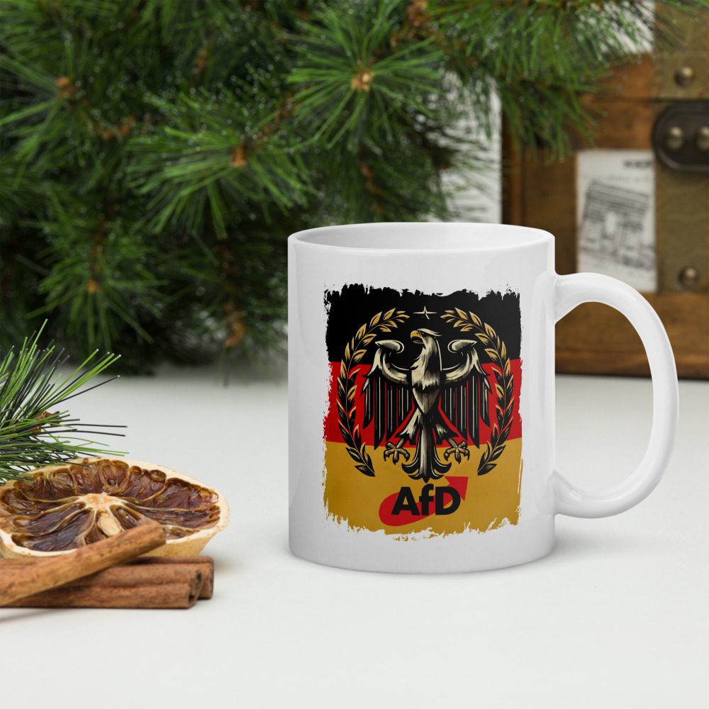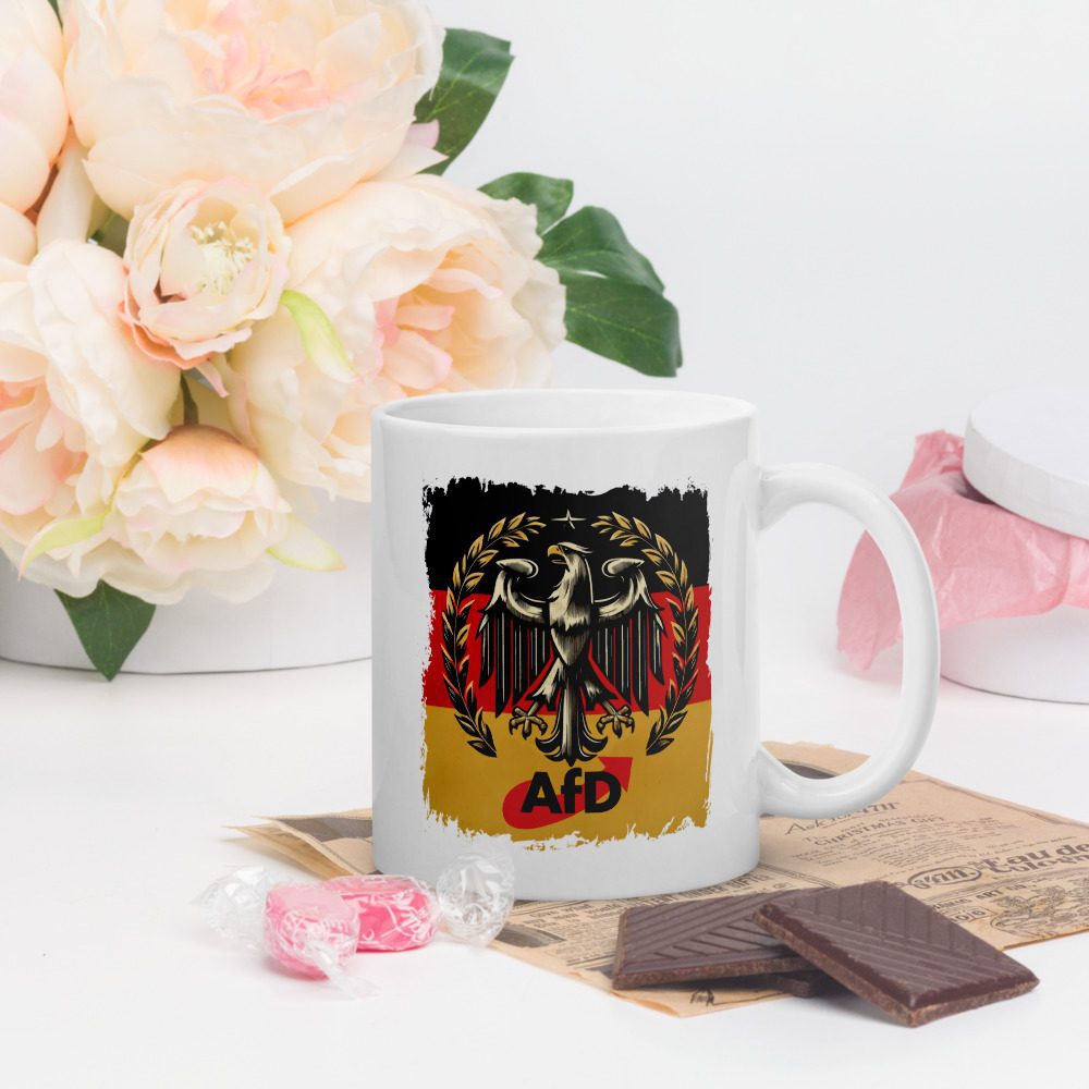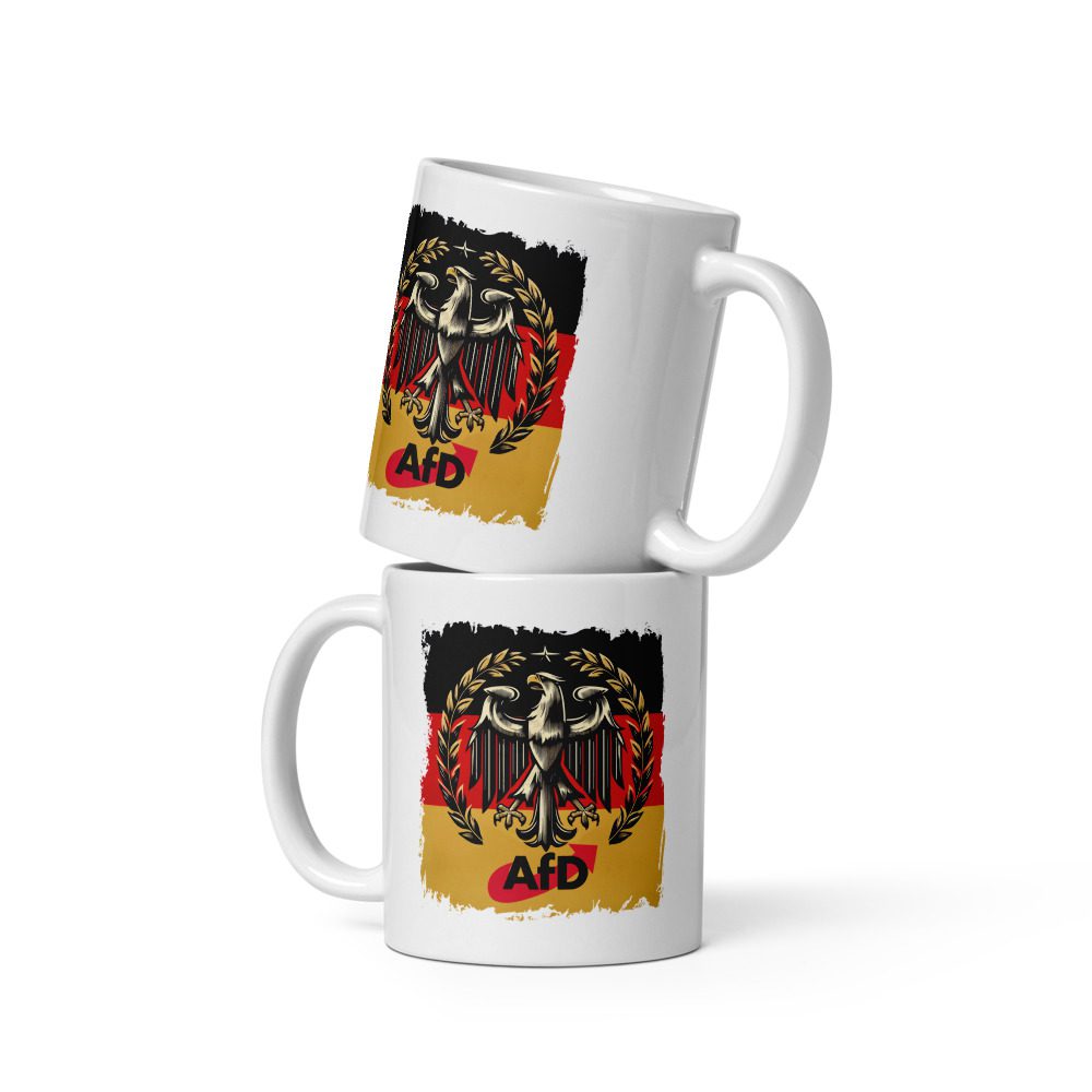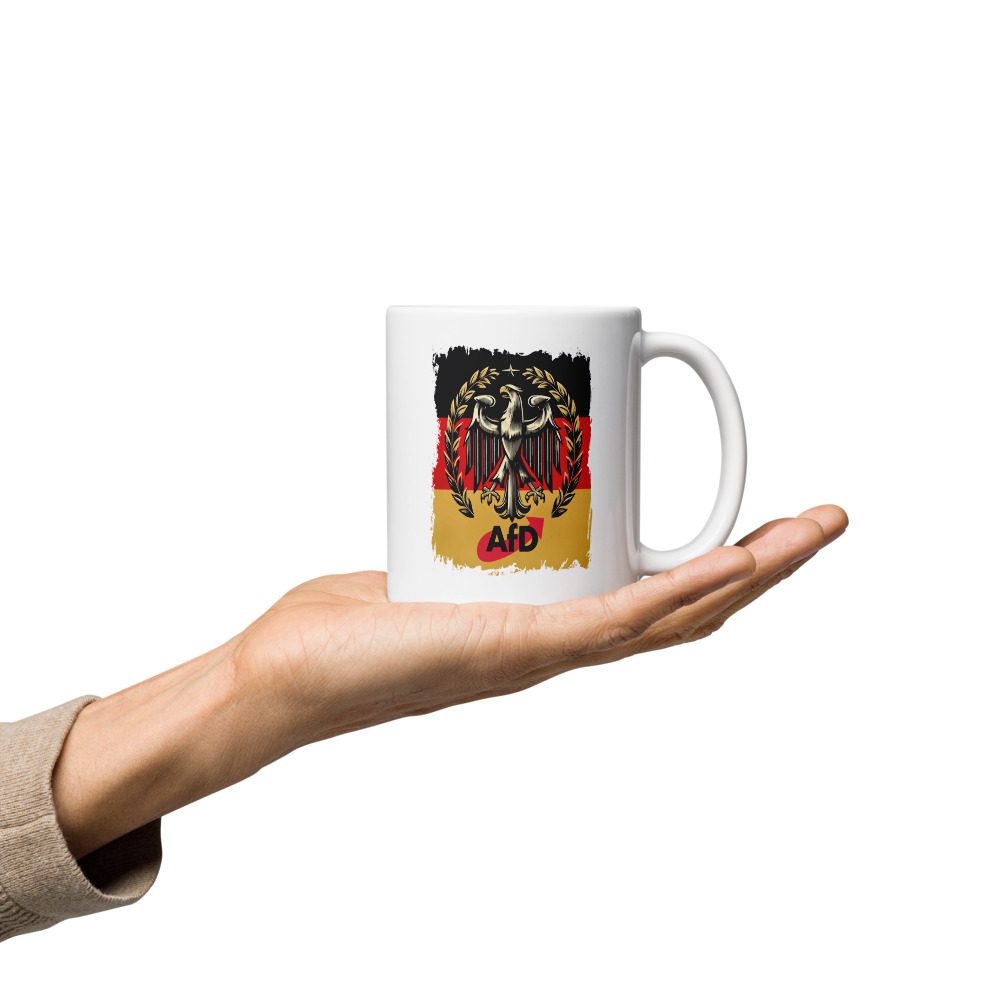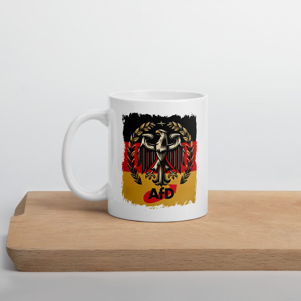 Die AfD Bundesadler Tasse Deutschland Flagge Statement Keramik ist eine robuste Alltagstasse mit ausdrucksstarkem Deutschland-Motiv und klarer Optik. Der stilisierte Bundesadler vor Schwarz-Rot-Gold setzt ein sichtbares Zeichen und wird zum Blickfang am Frühstückstisch, im Büro oder in der Werkstatt.