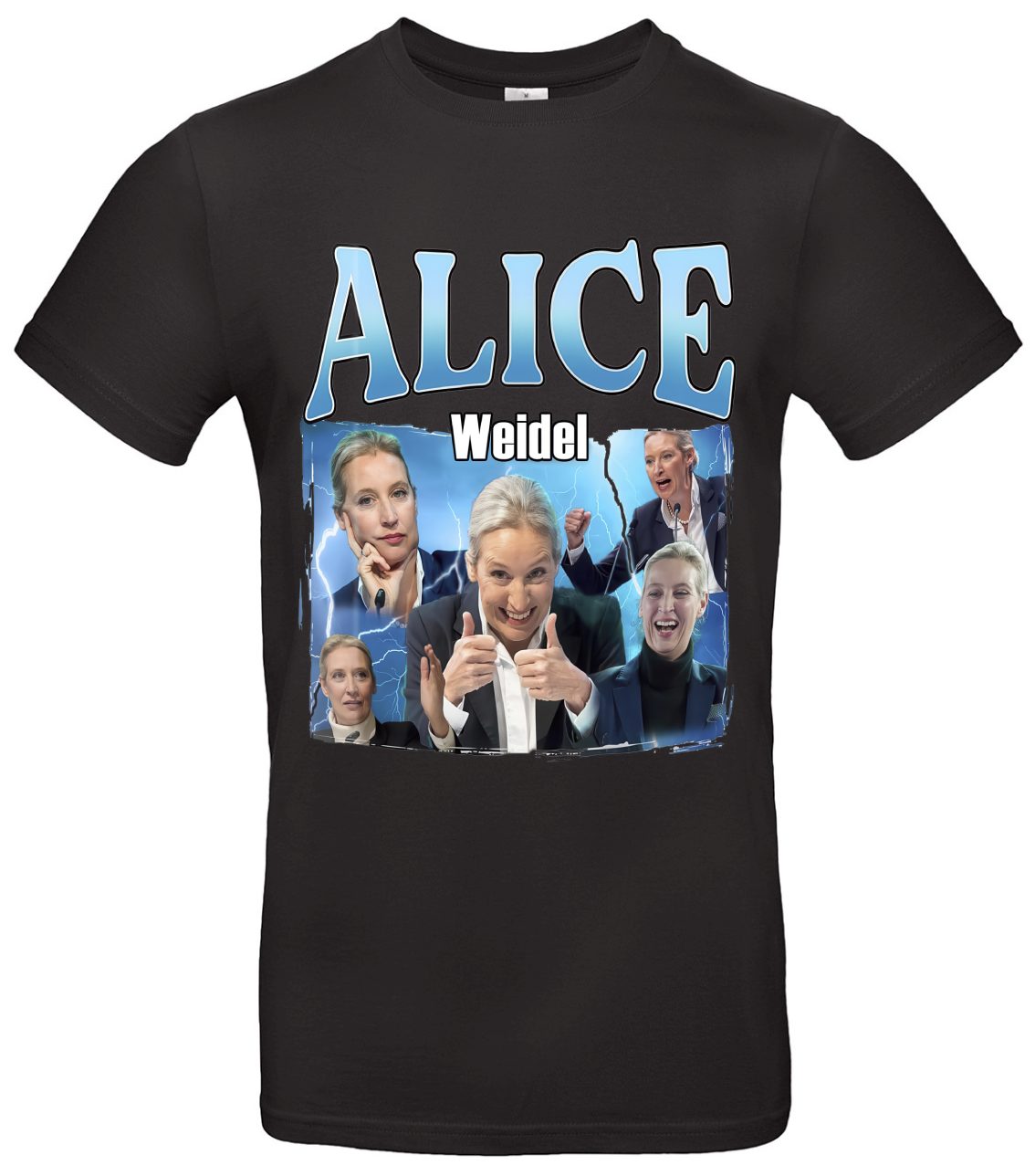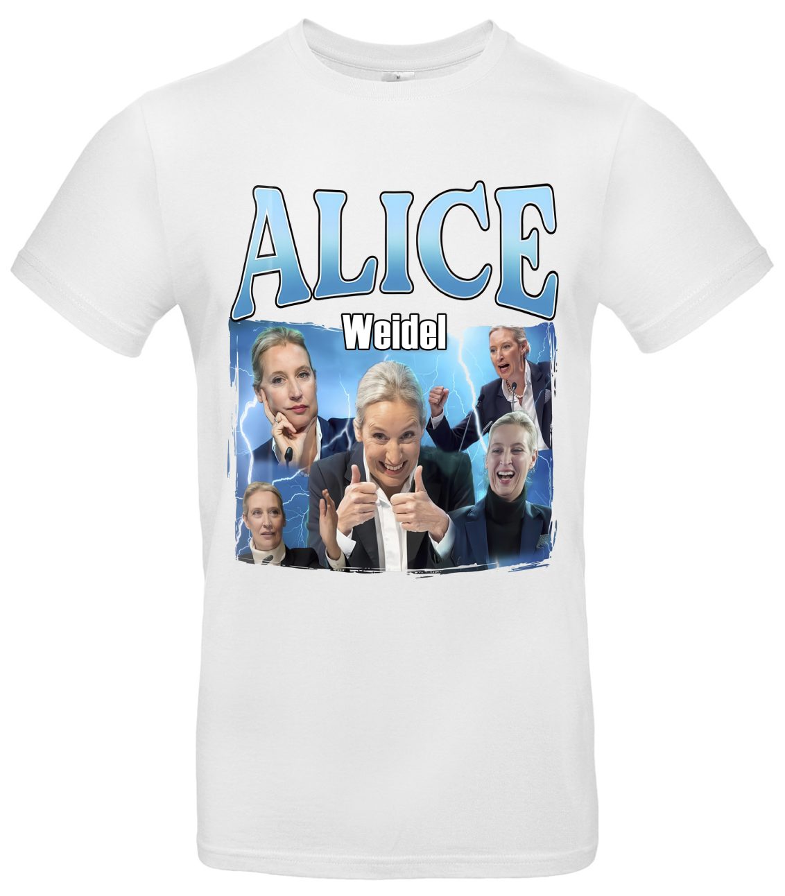 Alice Weidel T-Shirt Patriot Statement Klar Kante ist ein Politik- und Statement-Shirt für alle, die ihre Haltung selbstbewusst zeigen wollen. Das auffällige Alice-Weidel-Motiv in dynamischer Pose vor einem elektrisierenden Hintergrund sorgt für einen starken Look und macht dein Outfit zum Gesprächsanlass.