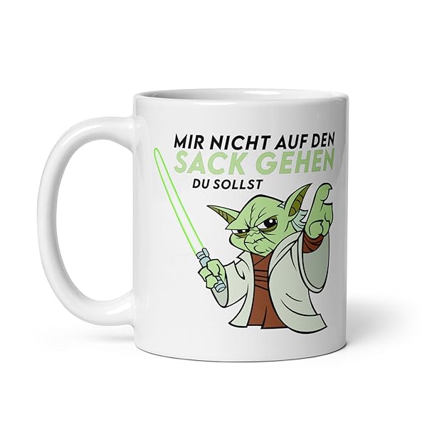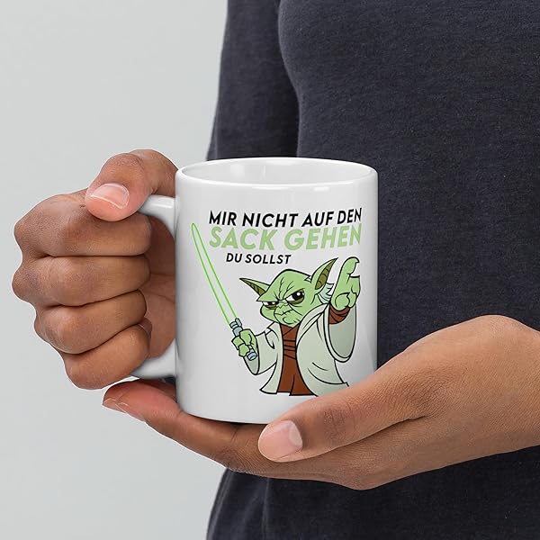 Lustige Yoda Tasse Mir-nicht-aufn-Sack Bürohumor ist genau richtig, wenn du deinen Kaffee mit Humor und klarer Kante trinkst. Der Spruch „Mir nicht auf den Sack gehen du sollst“ sorgt sofort für Schmunzeln und macht aus jeder Pause ein kleines Statement im Büro oder zuhause.