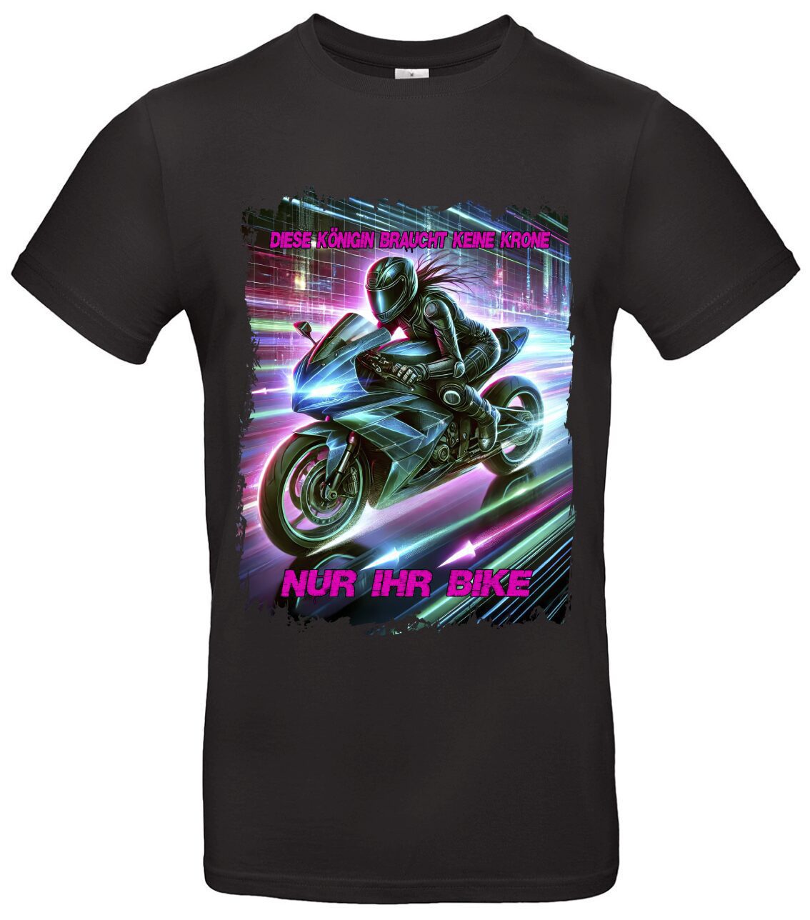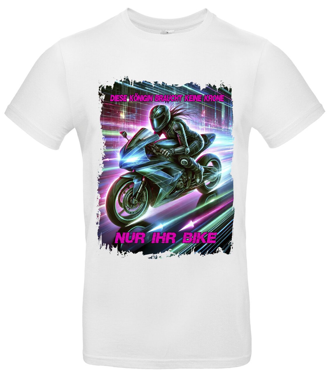 Das Motorradfahrerin T-Shirt steht für klaren Ausdruck und Alltagstauglichkeit. Das Statement-Shirt mit dem Spruch „Diese Königin braucht keine Krone – nur ihr Bike“ verbindet femininen Schnitt mit lässigem Look und ist ideal für Bikerinnen, die ihren Stil zeigen möchten. Das hochwertige Material sorgt für angenehmen Tragekomfort, die Passform schmeichelt der Figur und unterstreicht den charakteristischen Auftritt.