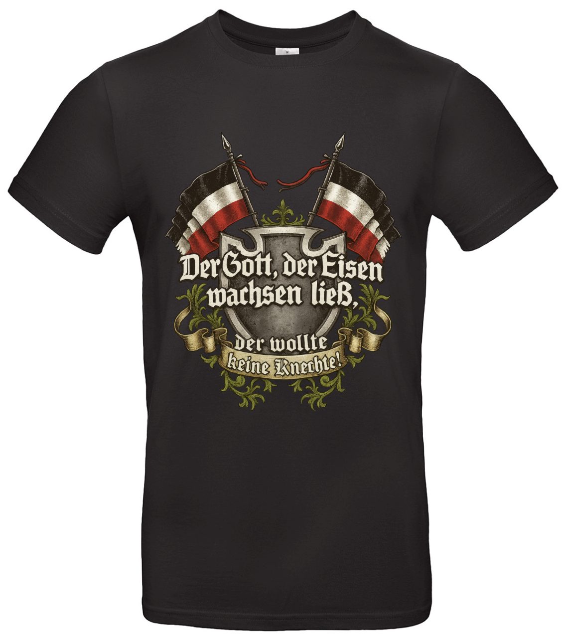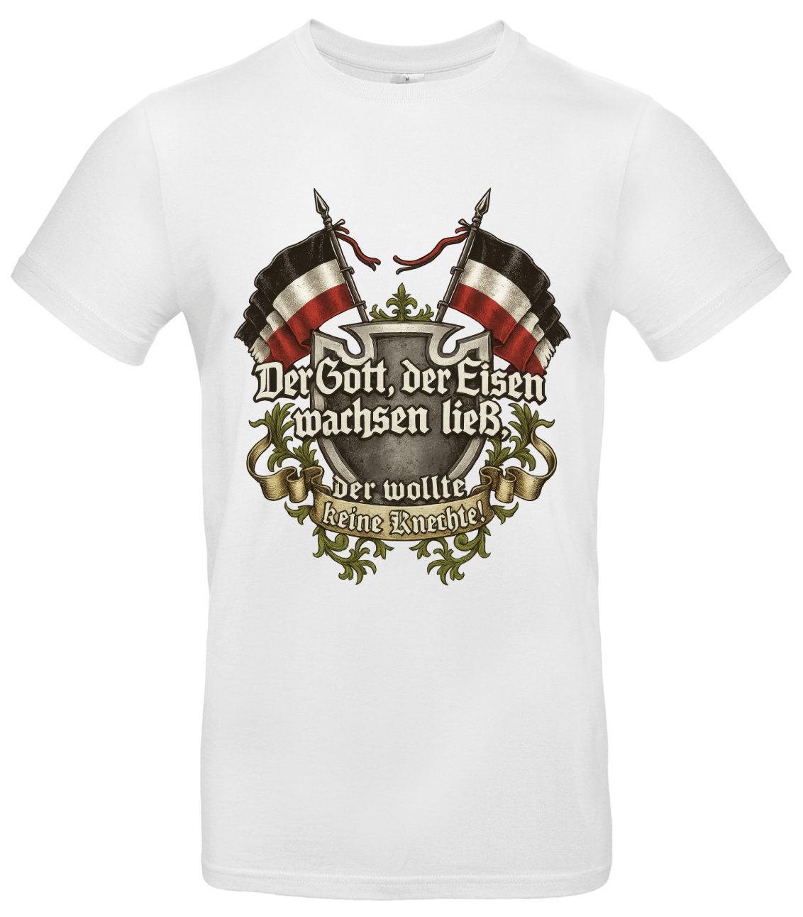 Im Mittelpunkt steht das kraftvolle Zitat „Der Gott, der Eisen wachsen ließ, der wollte keine Knechte“ inspiriert von Odin und dem Gedanken der germanischen Rebellion. Die hochwertige Grafik kombiniert den Spruch mit stilisierten Odin-Symbolen und Runenelementen und wirkt zugleich rau, modern und selbstbewusst. Ob zu Hause, beim Spaziergang oder unterwegs, der weiche Stoff trägt sich angenehm und der langlebige Druck macht das Shirt zum zuverlässigen Begleiter.