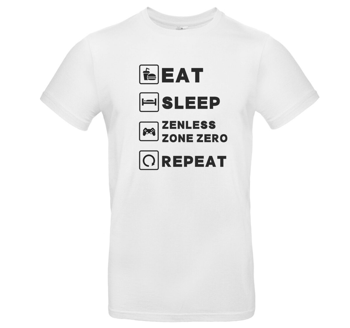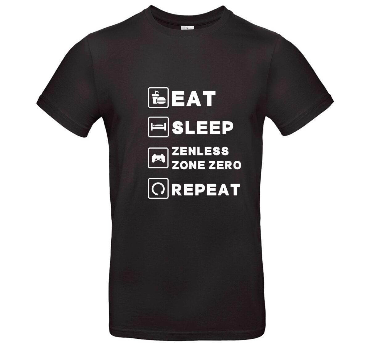 Zenless Zone Zero T-Shirt – zeige deine Leidenschaft mit Stil und Komfort. Dieses Premium-Shirt besteht aus weicher, atmungsaktiver Baumwolle, die angenehm auf der Haut liegt und auch bei langen Gaming-Sessions nicht einengt. Der langlebige Siebdruck mit dem kultigen Spruch „Eat Sleep Zenless Zone Zero Repeat“ setzt ein klares Statement und bleibt dank sorgfältiger Verarbeitung auch nach vielen Wäschen farbintensiv.